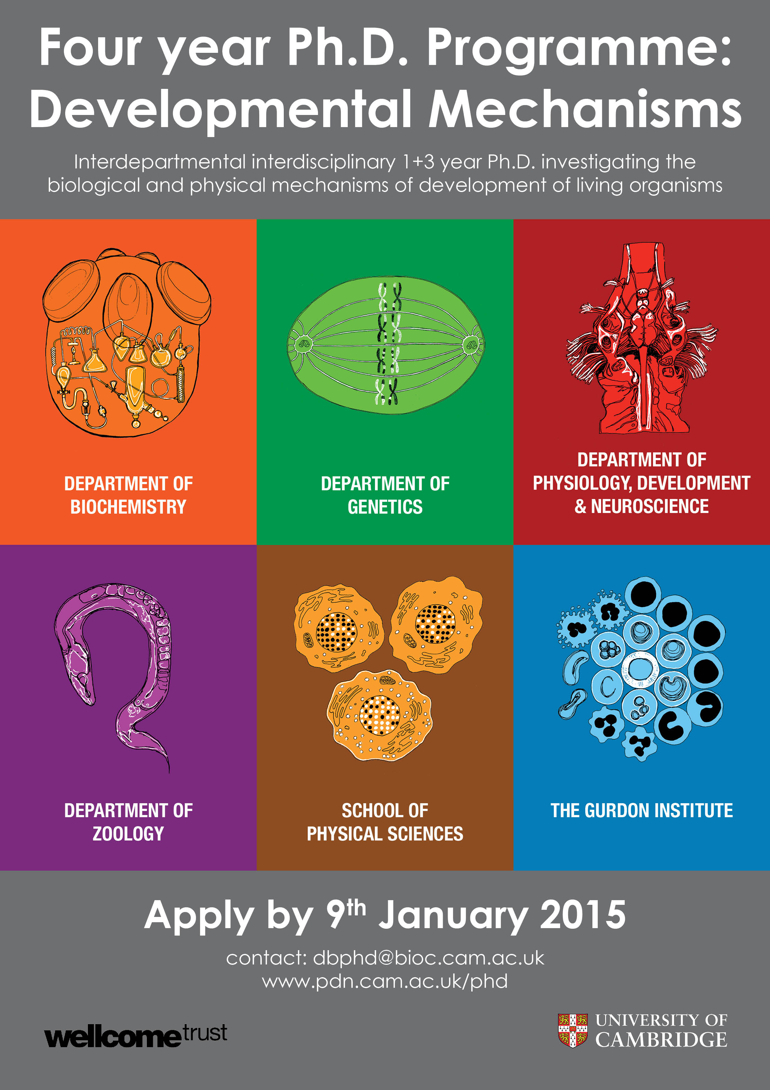 Applications are open for the Wellcome Trust funded four year PhD programme in Developmental Mechanisms at Cambridge. We are looking for talented, motivated graduates or final year undergraduates, and are keen to attract outstanding applicants in the biological sciences, who are committed to doing a PhD. We are able to fund both EU and non-EU students. Closing Date: 9th January 2015. For more details about the application process and the programme please see the website: http://www.pdn.cam.ac.uk/phd/