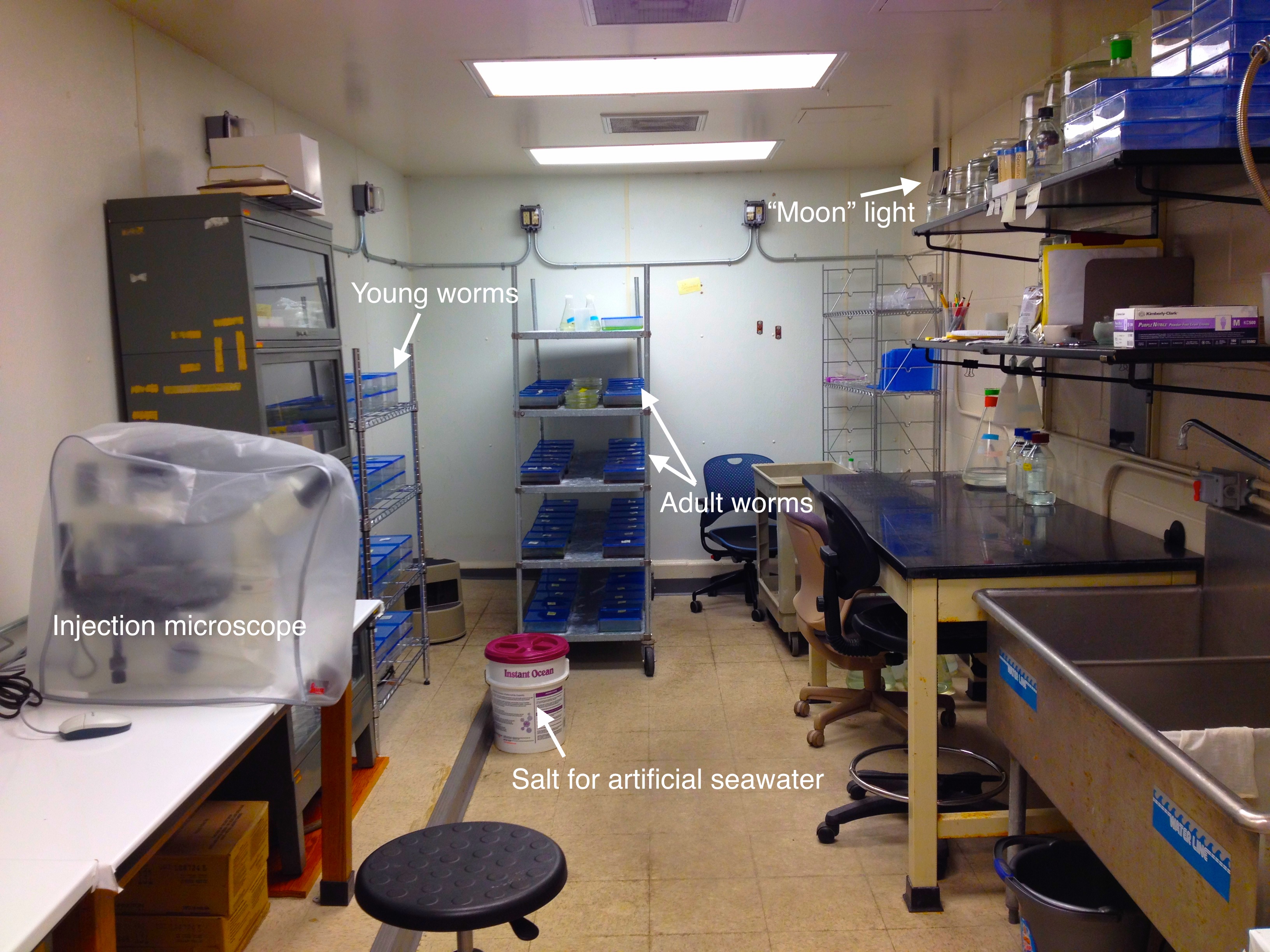 Our culture room. Notable features include boxes of adult or young worms, our artificial moonlight, and an injection microscope (yes, we can inject Platynereis embryos!).