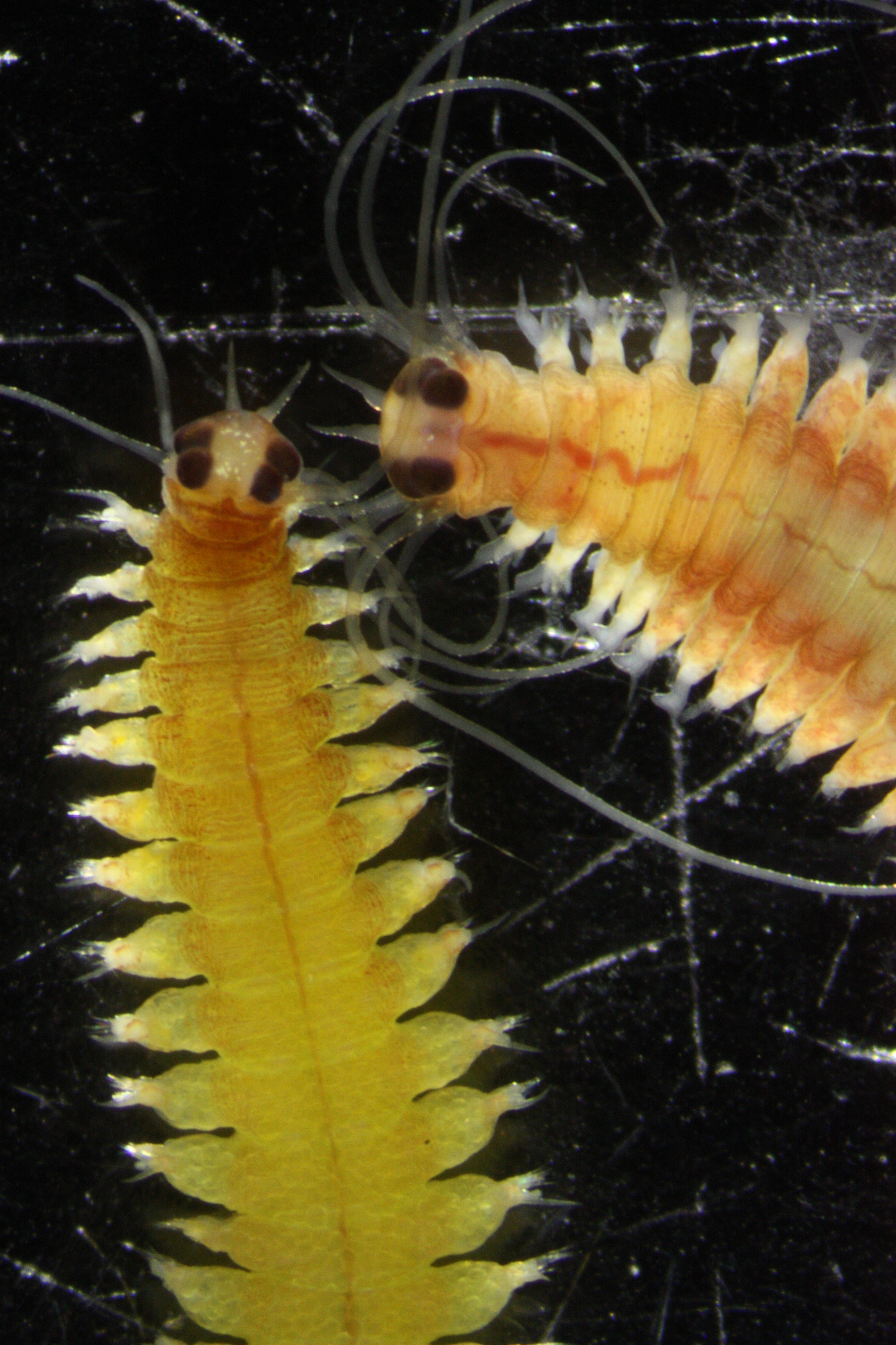 Sexual maturity and spawning in Platynereis dumerilii are synchronized by a lunar cycle. In the lab, the culture is on an artificial light cycle. The worms experience summer all year round, and so have 16 hours of light and 8 hours of total darkness each day. In addition, they are exposed to a 28-day night cycle in which three weeks of pitch-dark nights are followed by 7-days of full moon. Our high-tech recreation of this lunar cycle comes in the form of a $1.99 night light from Walmart, and a very reliable undergraduate researcher as a timer to turn the light on and off on the correct days. Sexually mature worms can be collected 3-6 days after our “moon” phase. Any disruption in this light cycle (exposing the worms to light during the dark phase), like leaving a digital clock on that has a bright backlight, has detrimental effects on the breeding success.