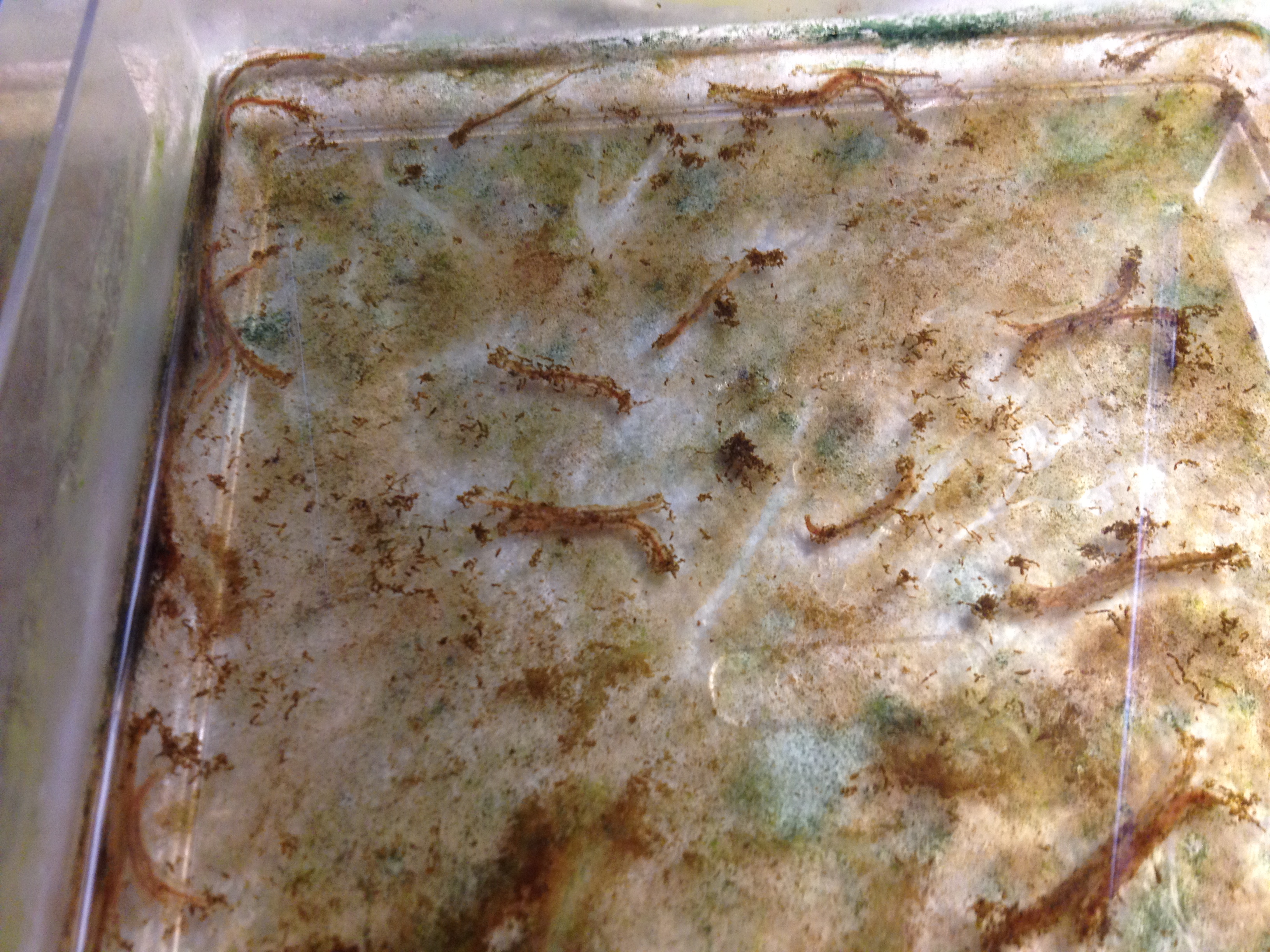 Here is one of approximately 90 boxes where we house our young and adult worms. In this box, you can see the many worms, each with their own silk tubes. If you look closely, you can even see one worm peeking out of its tube (right of center).