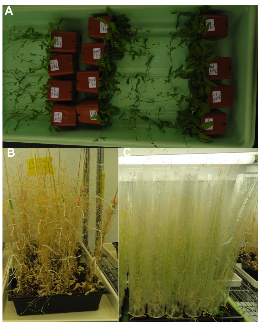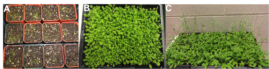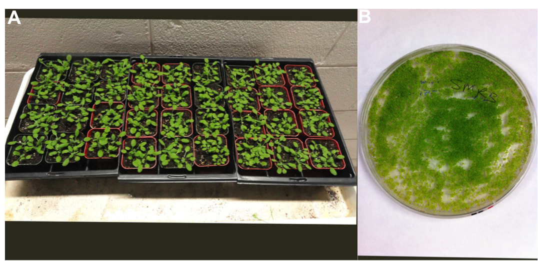 Soil works best when growing transgenic plants that need to be sprayed (see later), but if I have any other marker (such as kanamycin) or need a clean root without soil or dirt to study root development then MS medium plates (Fig.3A) are ideal. Arabidopsis in MS plate plants are transferred to soil later. Arabidopsis seeds are very tiny and can easily be scattered around and contaminate other seeds.