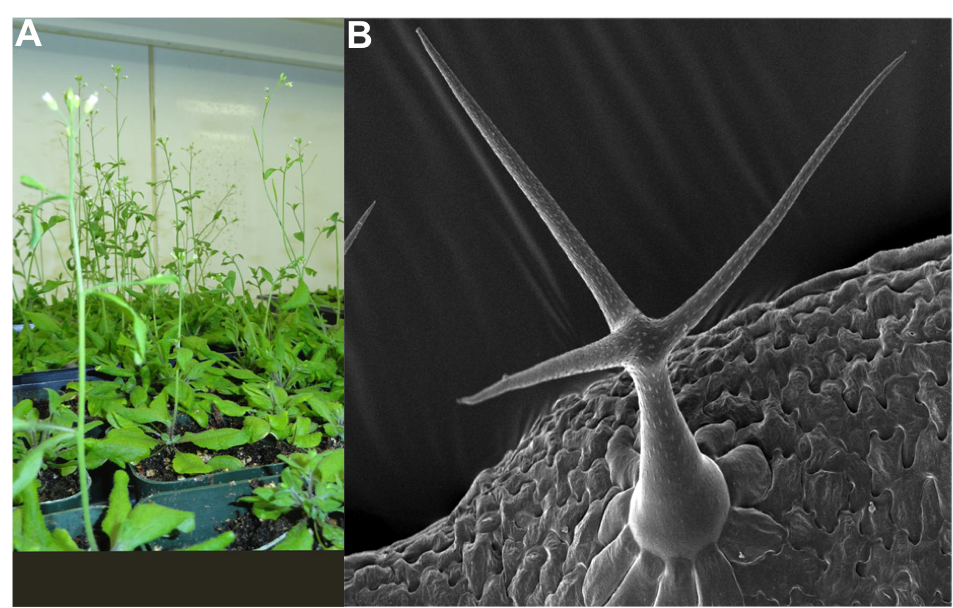 Fig-1. A) Arabidopsis plant in Growth chamber. B) Scanning Electron Microscopic Image (SEM) of Arabidopsis trichome