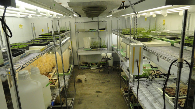 Growth Chamber: – We have a very nice habitat (a climate-controlled chamber, Fig-2) for our favorite Arabidopsis plants in the basement of the Life Sciences Building. This chamber always maintains a 21-22 °C temperature and is divided into different shelves to house the different groups of plants. Besides the growth chamber, we have a preparation room in which we do all Arabidopsis related chores including sowing the seeds, harvesting and washing etc.
