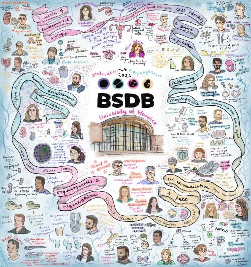 I recently attended the BSDB Spring Meeting, and decided to spend most of my time at the conference sketching. The result is this illustrated summary – featuring portraits of almost all the speakers alongside drawings of elements from their talks, whether that’s a model organism, a signalling pathway, or a particularly striking image from their work.