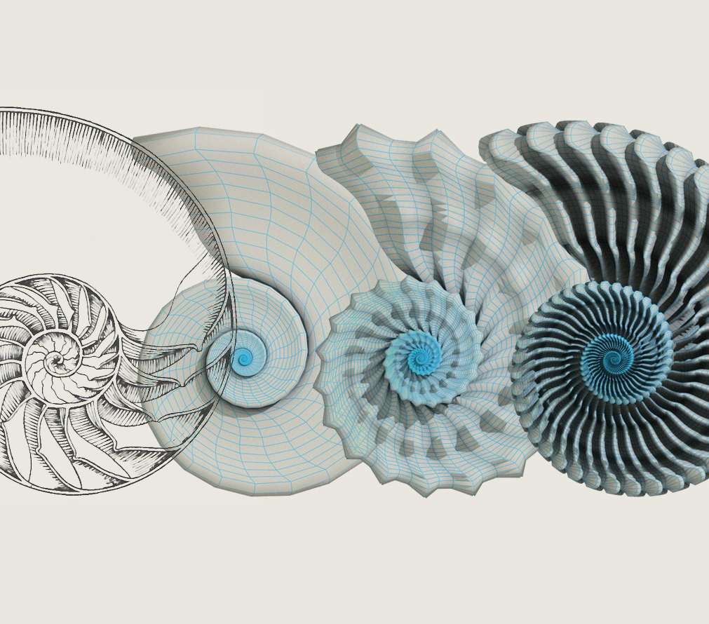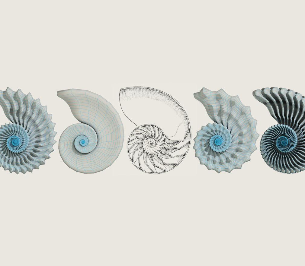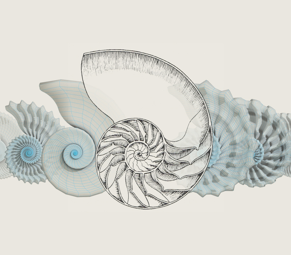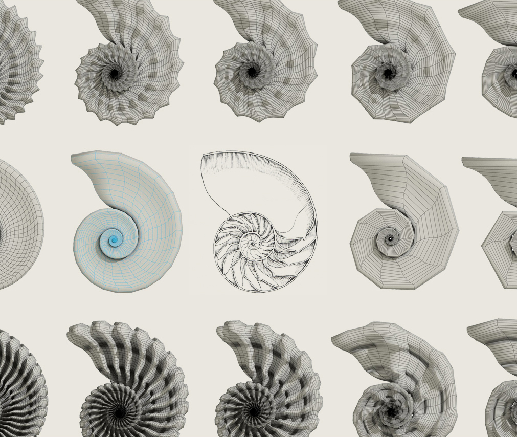 JM & MS A key to our ‘start’ was selecting one of the illustrations from the book that we wanted to work with. We debated between a few in particular – the Nautilus Shell, the Grid-Warped Fish, and the Radiolarian Skeletons. Ultimately we settled on the Nautilus Shell because we felt it was the most iconic and easily identified as being from the book. We then started sketching some layout options to integrate the biologically illustrated and digitally invented shells. The layouts provided us with a framework to move forward in our digital studies and, on a practical level, an estimation of how many digital forms we were going to make.