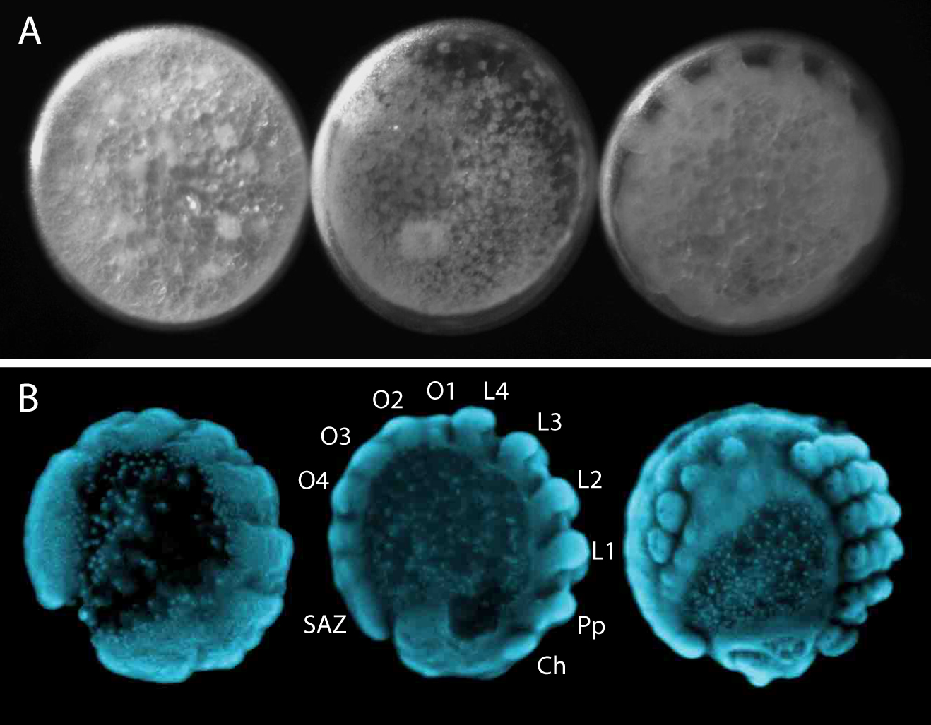 The segmented body plan of arthropods is an important feature that has likely contributed to their evolutionary success and morphological diversity. However, despite conservation of segmentation genes, different mechanisms of segmentation are used among arthropods. In contrast to the somewhat simultaneous development of all segments in Drosophila, Parasteatoda employs a short germ mode of development, which means that some anterior segments are specified first and subsequently the posterior segments are sequentially added from the growth zone or segment addition zone (SAZ) (Figure 4B). In the spider, aspects of vertebrate somitogenesis (Delta/Notch, Wnt signaling), as well as components of the well-studied Drosophila segmentation gene cascade have been found to play a crucial role in posterior segmentation.