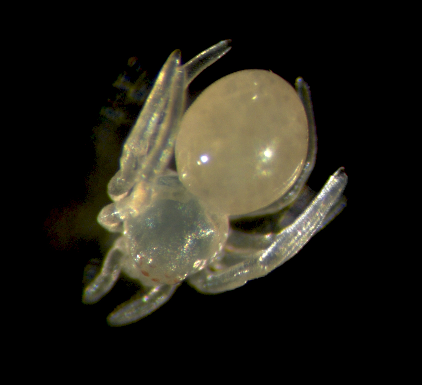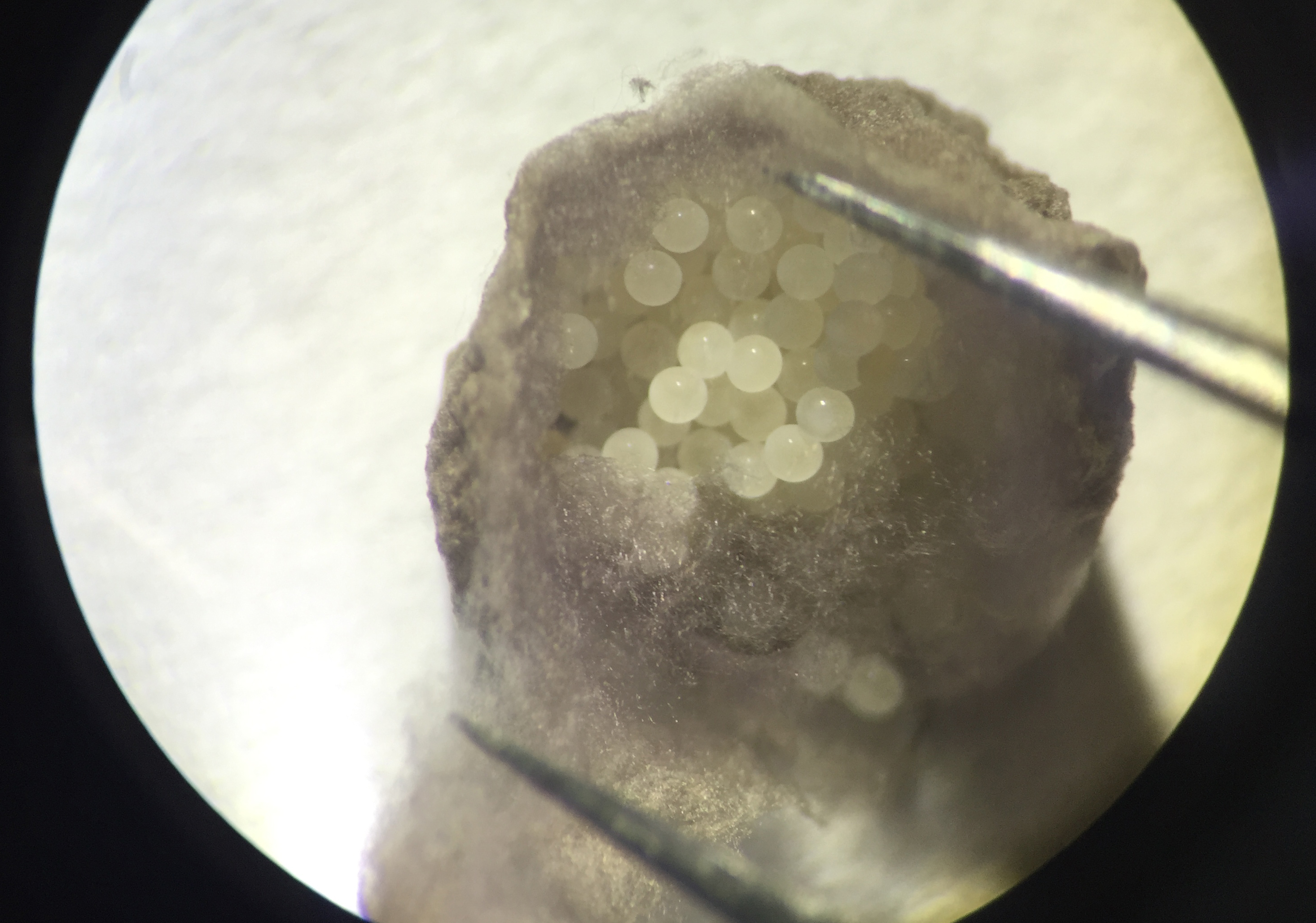Our regular day starts with collecting cocoons from females, which they produce approximately every four days. There are usually hundreds of embryos per cocoon, all at similar developmental stages (Figure 3). Developing embryos can be kept in halocarbon oil, which makes the otherwise opaque chorion transparent and allows us to observe the developmental stages (Figure 4A). This helps us identify the exact stage of embryogenesis, which is key for the different approaches that we use to study their development. It takes approximately 10 days for the embryos to develop into translucent, hairless, immotile hatchling spiders (Figure 5). Once the juveniles have progressed through several molts and eaten some flies (as well as a few of their brothers and sisters), they are separated into individual vials. In total, after hatching, it takes about another month for Parasteatoda to reach reproductive maturity.