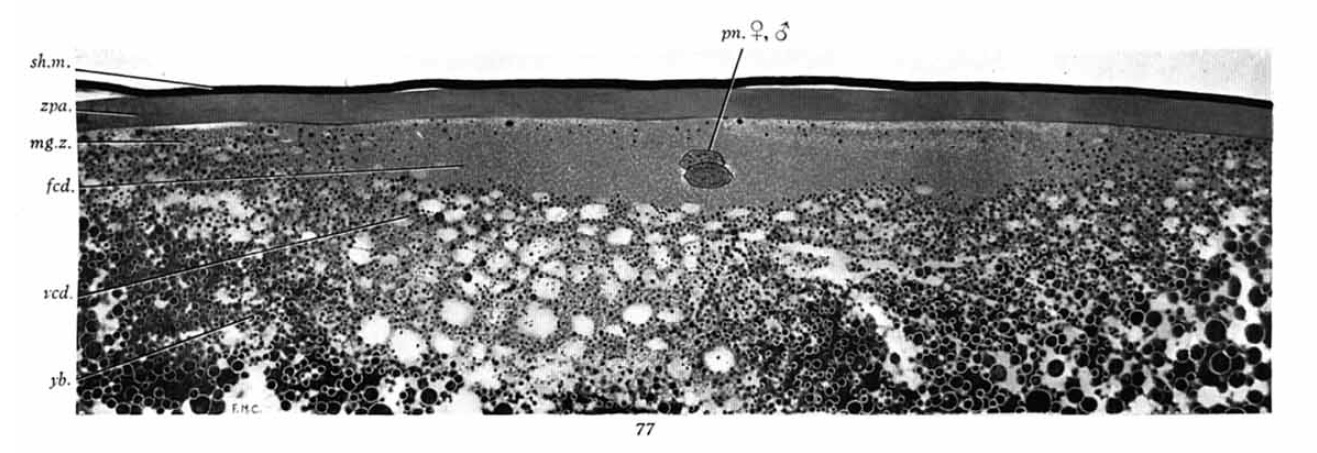 The two monographs describe observations on a collection of 150 or so monotreme eggs and embryos initiated in 1896 by Hill in Queensland, and later added to by Flynn in Tasmania. The samples were preserved in the field and then sectioned, stained and analysed in the lab, often decades later (one was embedded in wax thirty years before being sectioned with a myotome; there may have been half a century between a sample’s collection and the publication of its description). Volume IV describes the making of the monotreme oocyte, its fertilisation and the early cleavage stages of the embryo. Volume VI goes from cleavage until germ layer formation.