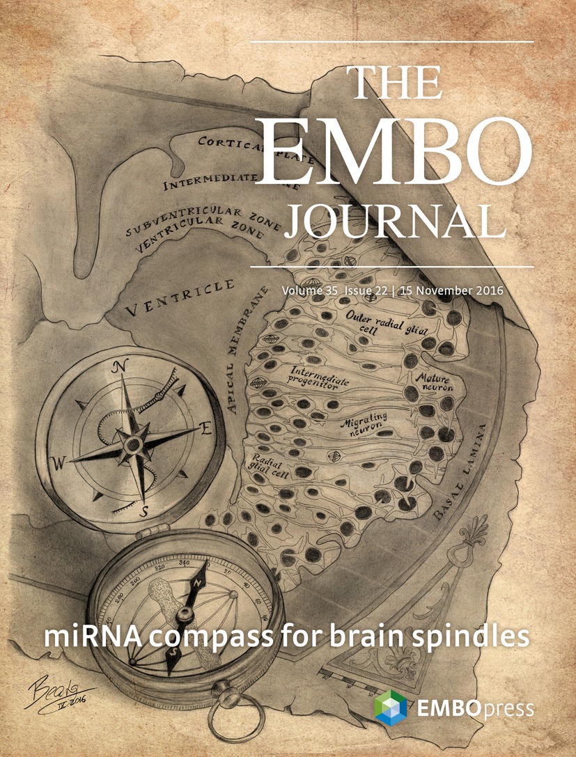 EMBO Journal Cover. This EMBO Journal cover accompanies a paper on mammalian brain development I was involved in during my Master’s Thesis. The compass represents how the angle of the mitotic spindle in dividing cells affects their ultimate position within the brain – similar to a compass guiding the way to a location on a map.