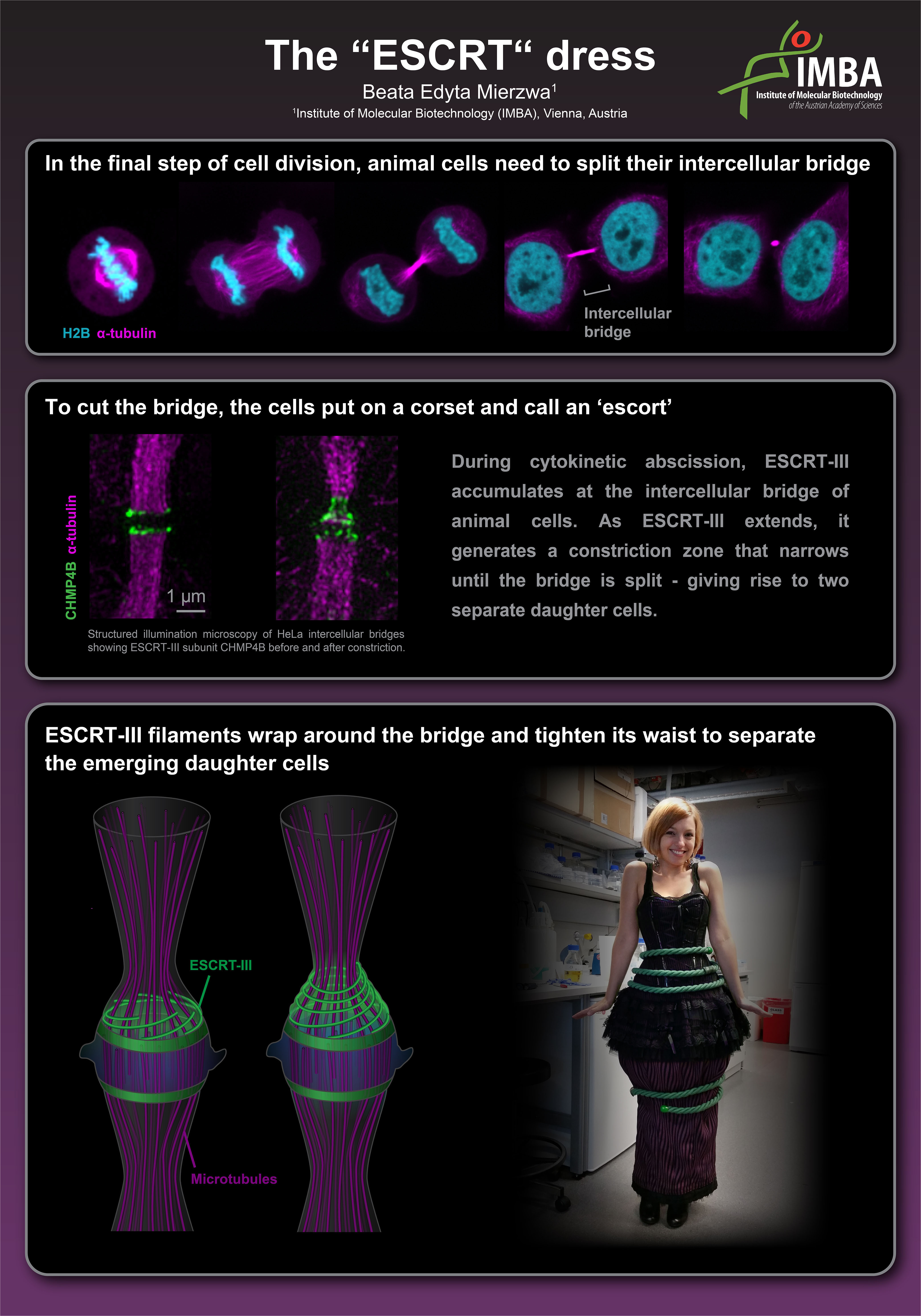 The ‘ESCRT’ Dress. Cytokinetic abscission is mediated by a machinery composed of the Endosomal Sorting Complex Required for Transport (ESCRT)-III, which forms polymers that constrict the intercellular bridge until the membranes split. I created this “ESCRT” dress to illustrate how ESCRT-III separates the emerging daughter cells during abscission.