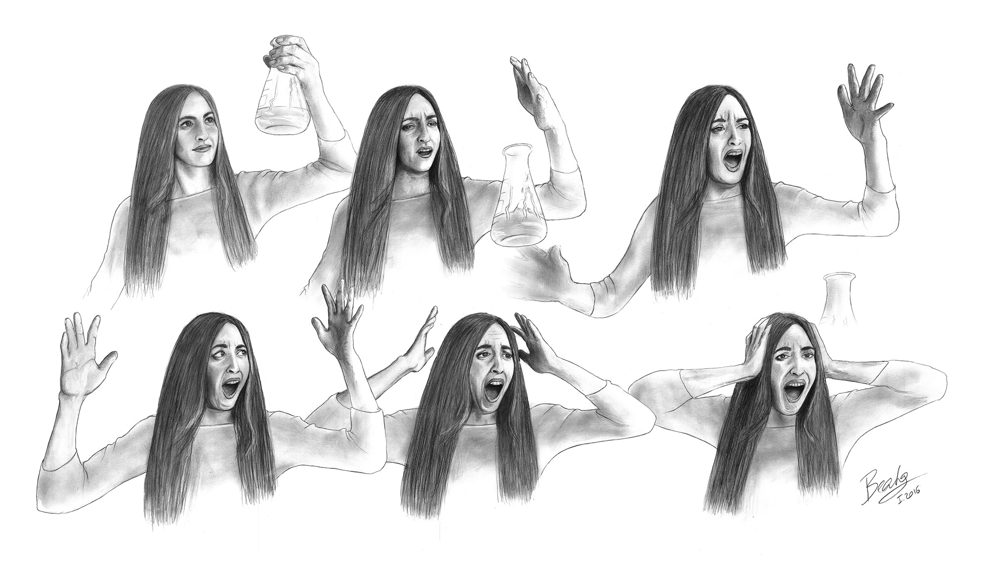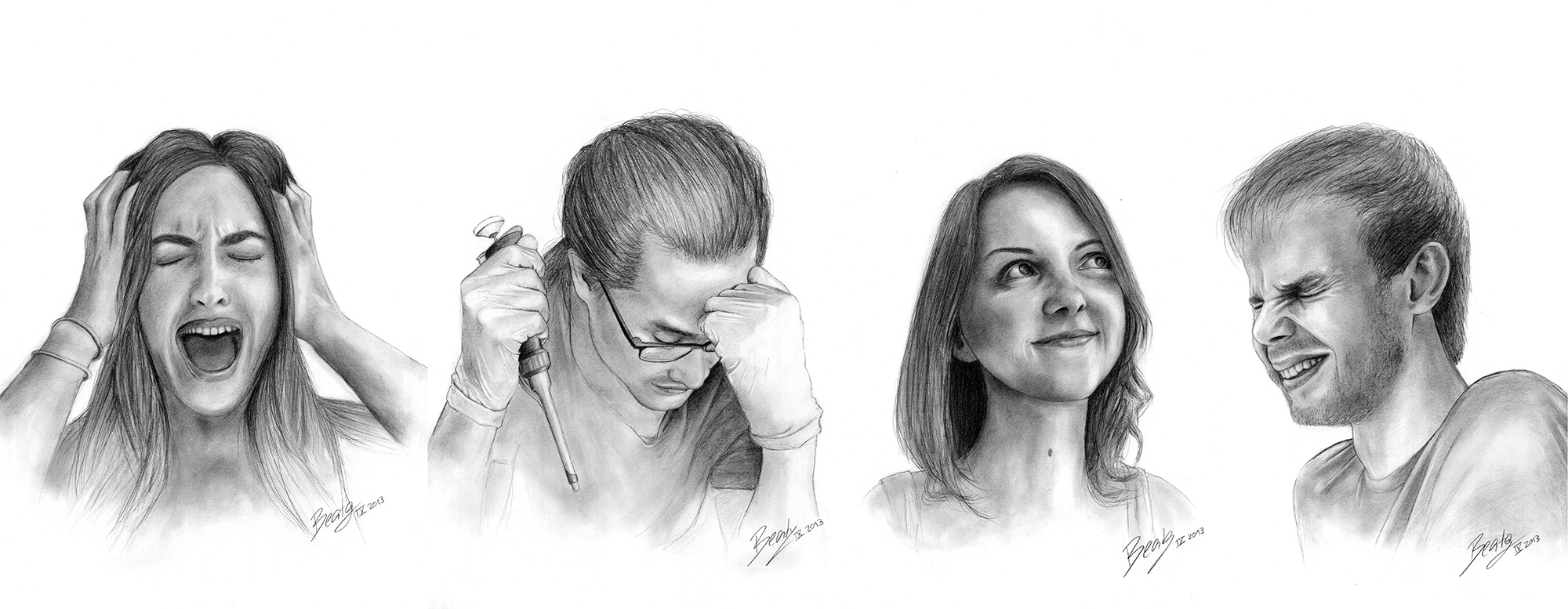 When Devotion Begets Emotion. These portraits of my fellow PhD students illustrate the intense emotions researchers face in everyday life in the lab. These drawings were part of a contribution to the Art & Science contest at the Vienna Biocenter, for which my team received the first prize in 2013.