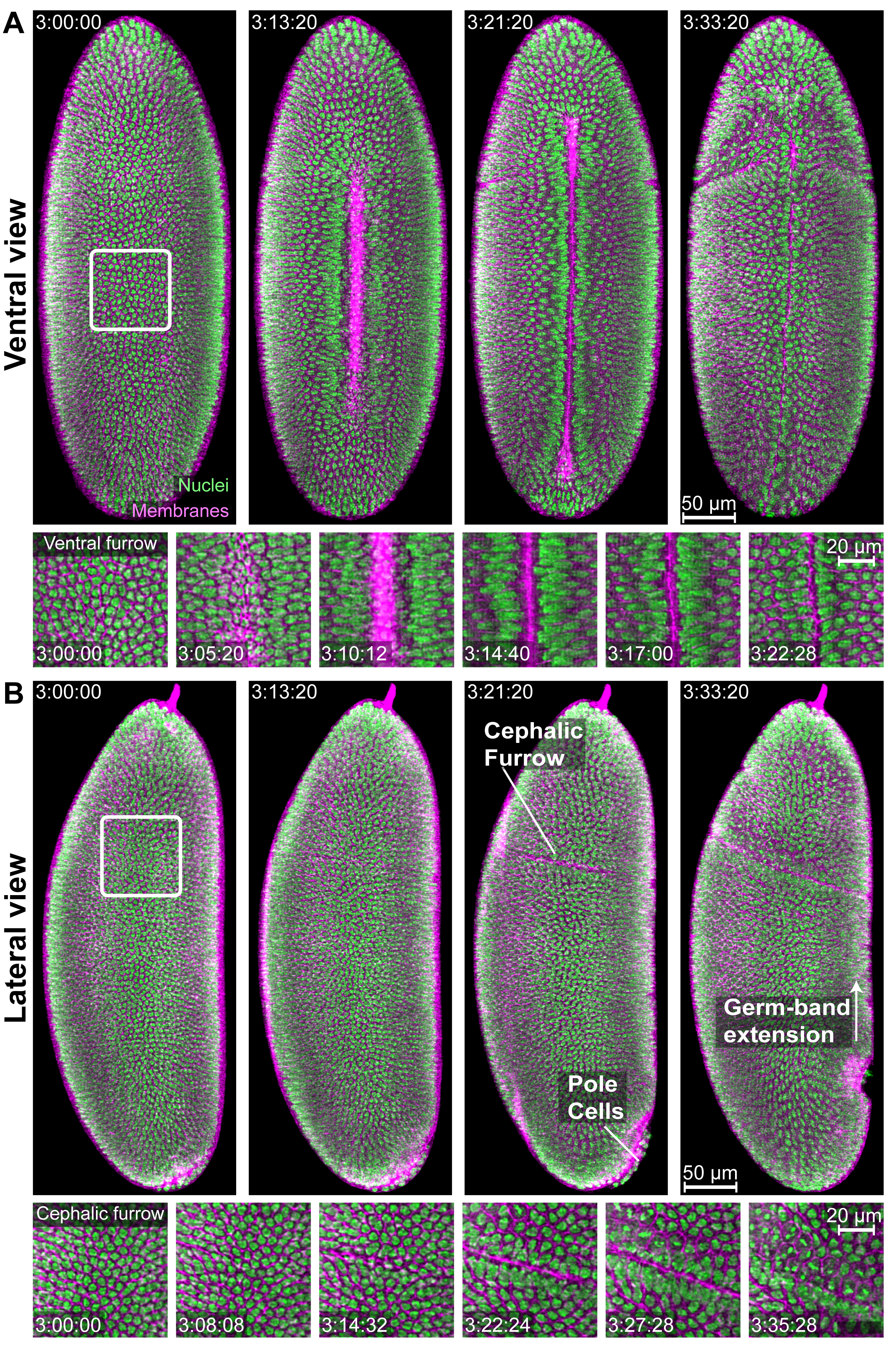 As our first demonstration, we performed IsoView imaging of an entire 1st instar Drosophila larva expressing cytoplasmic GCaMP throughout its nervous system at a rate of 2 volumes/sec over a period of over 8 hours— an illustration of a functional imaging experiment performed at developmental timescales. To the best of our knowledge, this is the first demonstration of whole-animal functional imaging performed in a higher invertebrate. The IsoView images from this recording show cellular and sub-cellular morphologies with unprecedented details along all viewing angles, thus constituting an accurate three-dimensional representation of the sample that no longer suffers from spatial resolution bias along any preferred direction. We also demonstrated isotropic, sub-cellular resolution functional imaging at a sustained rate of 1 volume/sec in a 3-day old zebrafish larva expressing GCaMP throughout its nervous system. To the best of our knowledge, this constitutes a first demonstration of spatially isotropic, sub-cellular functional imaging of a whole-brain in a vertebrate. The images from this recording show the power afforded by IsoView in unambiguously discerning single neurons even from within a dense ensemble of neurons located deep inside a large specimen such as a zebrafish larva, the size of which is approximately 400-fold larger than C. elegans embryos. Lastly, a demonstration of simultaneous two-color imaging was also performed in a gastrulating Drosophila embryo expressing nuclear-localized RFP and membrane-localized GFP. The entire volume of the embryo was acquired from four views in both color channels every 4 seconds, which offers good temporal resolution to capture in detail key events during gastrulation, such as ventral furrow formation, cephalic furrow formation, movement of pole cells, and germ-band extension (Figure). Owing to the isotropic micron-level resolution, we were able to reliably distinguish neighboring cells and resolve morphological features at the subcellular level across the entire embryo in the 2-color recording of the gastrulating Drosophila embryo.