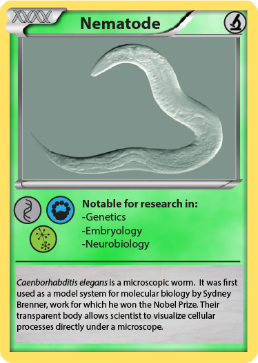 Model organisms have become indispensable tools in biological research and have enabled innumerable advances in our understanding of life. But while many people are versed in core concepts involving cells, DNA and genes (my mother can give a pretty good explanation of CRISPR!), they are sometimes un-aware that the majority of the research behind these concepts is attributed to a handful of unique, sometimes exotic, organisms. Occasionally, particularly ignorant politicians have attacked such research as frivolous! Clearly there is a need to familiarize the greater public with the existence of our beloved model systems. We made PokeMods as an introduction and tribute to some of these models. We hope that after interacting with the cards, someone will walk away with a greater appreciation for these organisms.