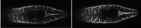 In this picture, you can observe the expression of the stem cell marker H2B in grey. On the left, you can see a control (normal) planarian flatworm whereas on the right you can see a planarian flatworm in which the expression of yorkie was turned down by genetic engineering. When compared to the normal planarian flatworm, you can see that there is more H2B, thus more stem cells, in the modified planarian flatworm. From this, authors conclude that yorkie is important for maintaining the right amount of stem cells in planarians.