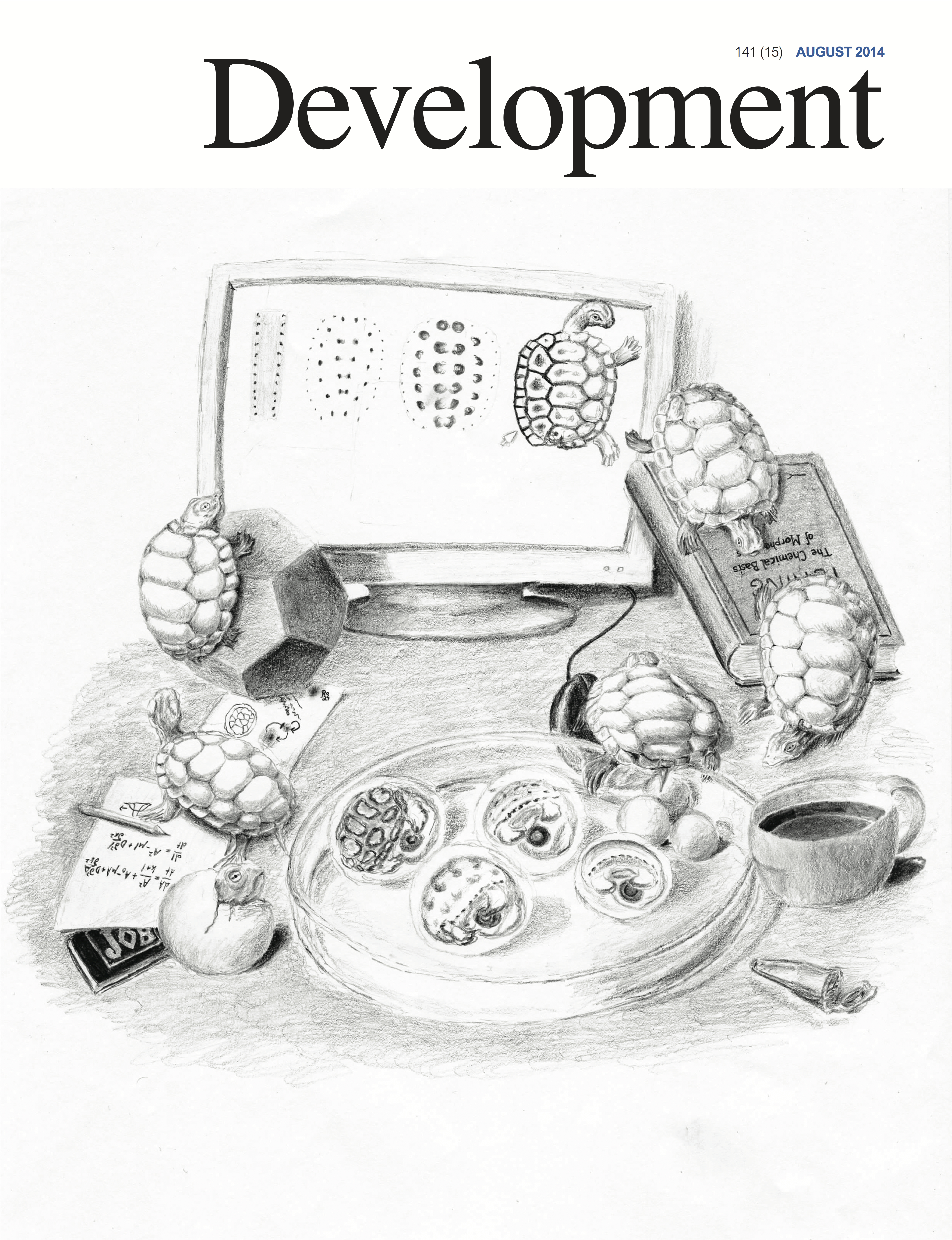 Such unbroken interlocking of shapes in a two-dimensional space is called tessellation, and one of the best-known artists whose work is linked to tessellation patterns is the Dutch graphic artist M. C. Escher. The illustration for the cover of the journal pays homage to Escher, and was done by Roland Zimm, the researcher who did the majority of the mathematical modeling in this article. Taking advantage of the geometrical parallels in his art, he re-drew a famous drawing of Escher’s, Reptiles in a modified way to depict key elements of our experiments. He gave himself the challenge of visualizing a unification of development in vivo and in silico, by integrating computational simulations within an idealized life circle of “real” turtles. A second homage is given to Alan Turing, who was a pioneer both in the fields of the foundations of computers and natural pattern formation. Turing’s reaction-diffusion mechanism is central to our hypothesis of scute patterning. This integration of computational modeling, experimental evo-devo, and classical art emphasizes the importance of cohesive interdisciplinarity in life sciences.