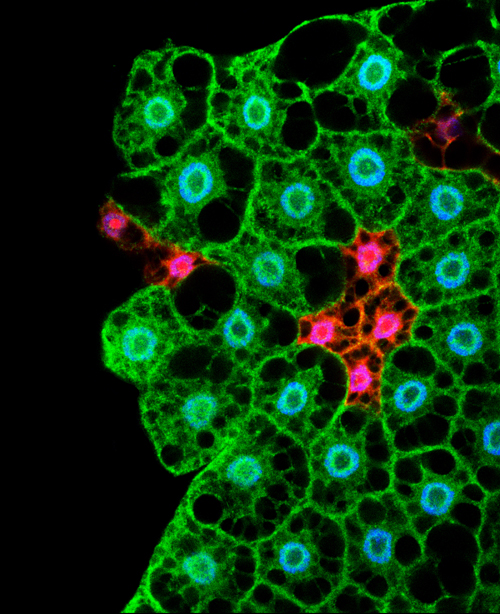 Image of the fat body tissue. In red, structures responsible for storing lipids (Lara Barrio, IRB Barcelona)