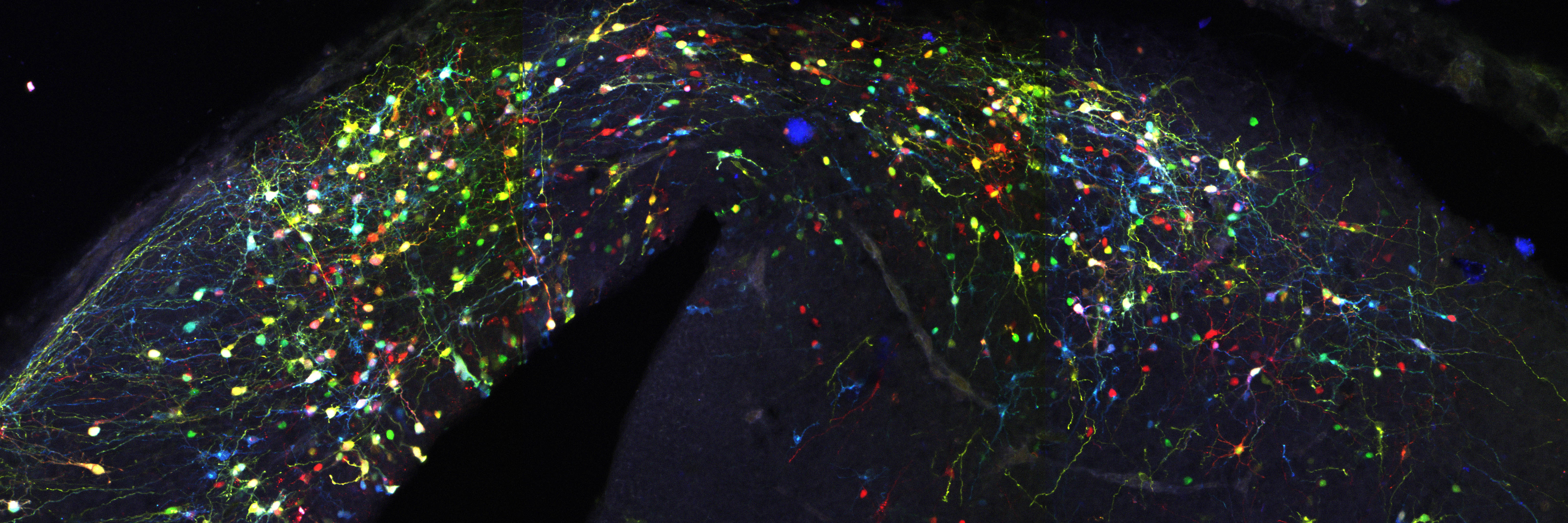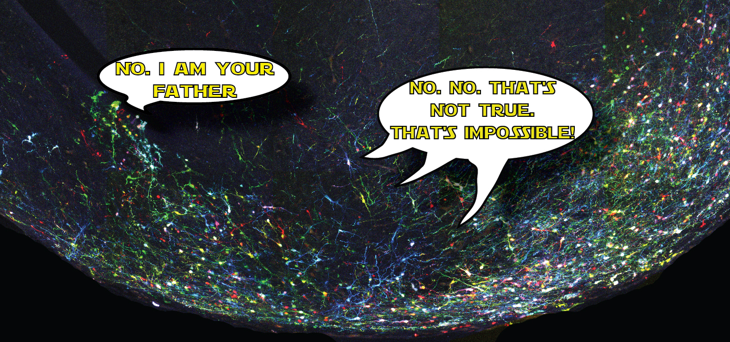 Actually not, since this simple system entails two major limitations. First that a single reporter gene doesn’t generate variability of surnames that would be enough to reliably discriminate among the billions of cells comprising a whole organism, e.g. someone is called Jones in Wales, or Molnár in Hungary. If we were all called Smith in UK, or García in Spain, it would be impossible for a genealogist to reveal the familiar origins and relationships of any of us. In our method CLoNe, inspired by the multi-coloured fluorescent Brainbow mice (Livet et al., 2007), we tackled this weakness by transfecting numerous distinct reporter genes, a total of twelve different fluorescent proteins. These 12 proteins are capable of generating thousands of different combinations on the basis of combinatorial hue, subcellular expression pattern of the fluorophores and intensity of the fluorescence (Fig. 1, observe the variability of fluorescent hues of the transfected cells in the chick brain). This extension in the number of reporter genes and their countless permutations is able to generate a vast amount of distinguishable surnames. Now, in addition to the Smiths we can distinguish the Jones and the Clayworths, or even the multiple-barrelled names (e.g. Smith-Jones-Clayworths–Howshams) that are truly unique. This is an idea that has been utilised in Spain for centuries (e.g. García-Moreno, or Manuel-Duarte-de Bendito) and now driving Pubmed Citations into a much more secure grounds.