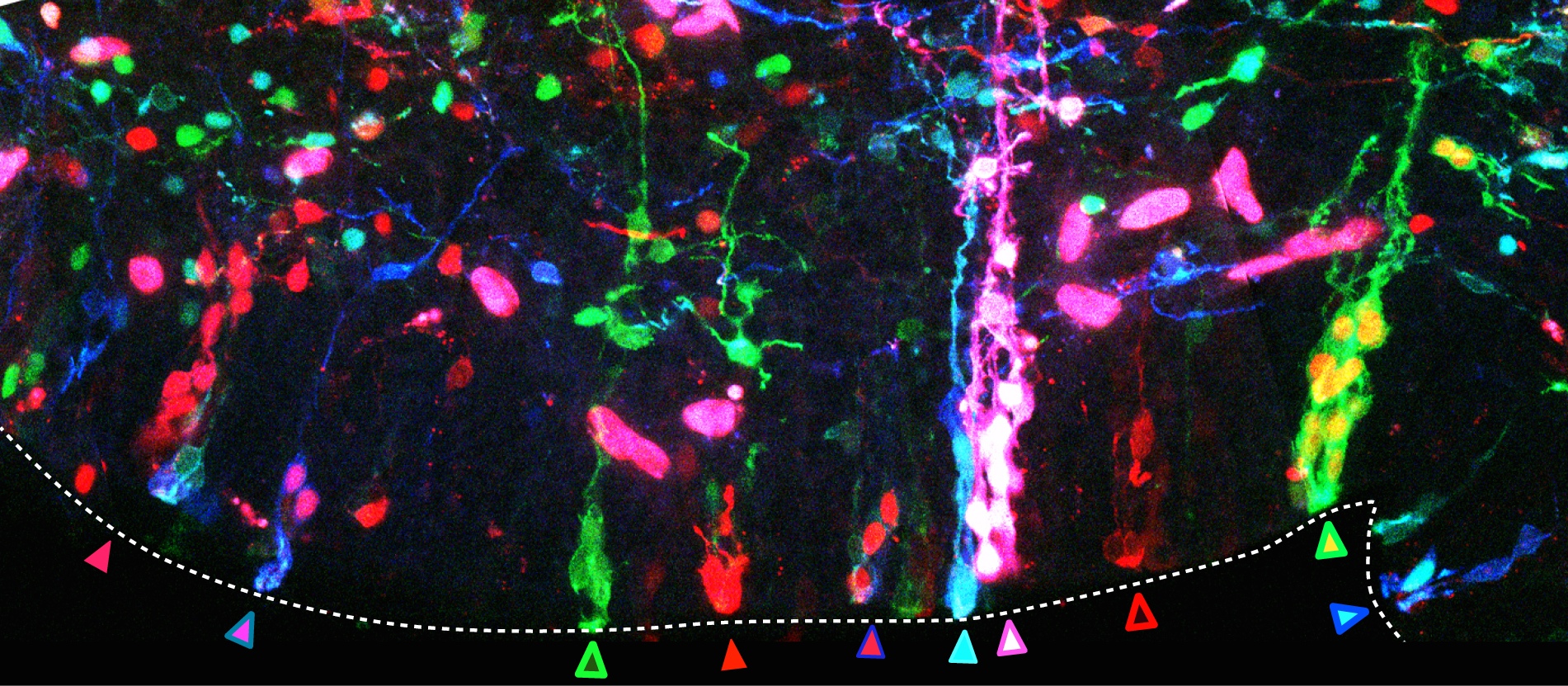 The second important drawback of the transfection by electroporation method implies the dilution of the fluorescent proteins till they are finally lost by successive cellular divisions (e.g. in Spain the family name is changing as you go down on generations, rather than sticking to the same multi-barrelled names). The transfected DNA constructs remain episomal, in the cellular cytoplasm, and distribute to the daughter cells during mitosis. Due to the finite number of DNA copies transfected, daughter cells inherit fewer and fewer DNA copies after each cell cycle and after a certain and unknown number of divisions, they don’t inherit the mark anymore. As a consequence, cells generated after the loss of the reporter gene are indistinguishable from non-transfected cells. So an unspecified portion of the cell lineage would be erroneously considered not belonging to the lineage. Imagine that after several generations the Smiths or the Clayworths forget their surnames. Our imaginary genealogist wouldn’t be able to relate individuals from different generations. In our method, influenced by Star Track method for labelling astrocytic clones (García-Marqués et al., 2013), we recombined the reporter genes into the nuclear genome of the transfected cells by means of the piggyBac transposon (Ding et al, 2005). Transposons are genetic elements that can jump to different locations within the genome. In our case, a random number and combination of the various reporter genes jump from the episomal constructs into the host genome of the transfected progenitor cell. During cell cycle, DNA synthesis duplicates the combination of reporter genes present in the genome and daughter cells inherit identical copies of the cellular surname, the combinatorial fluorescent expression (Fig. 2, progenitor cells at the germinal zone of the chick brain; chains of cells derived from the same stem cell share a common colour palette of fluorescent proteins). Back to genealogy (or should I say gene analogy?), our transposition system perpetuates the Clayworth surname in the family to all descendants; every new generation will always be called Clayworth. However, do we know that all the Clayworths are related and descend from the same original Clayworth?