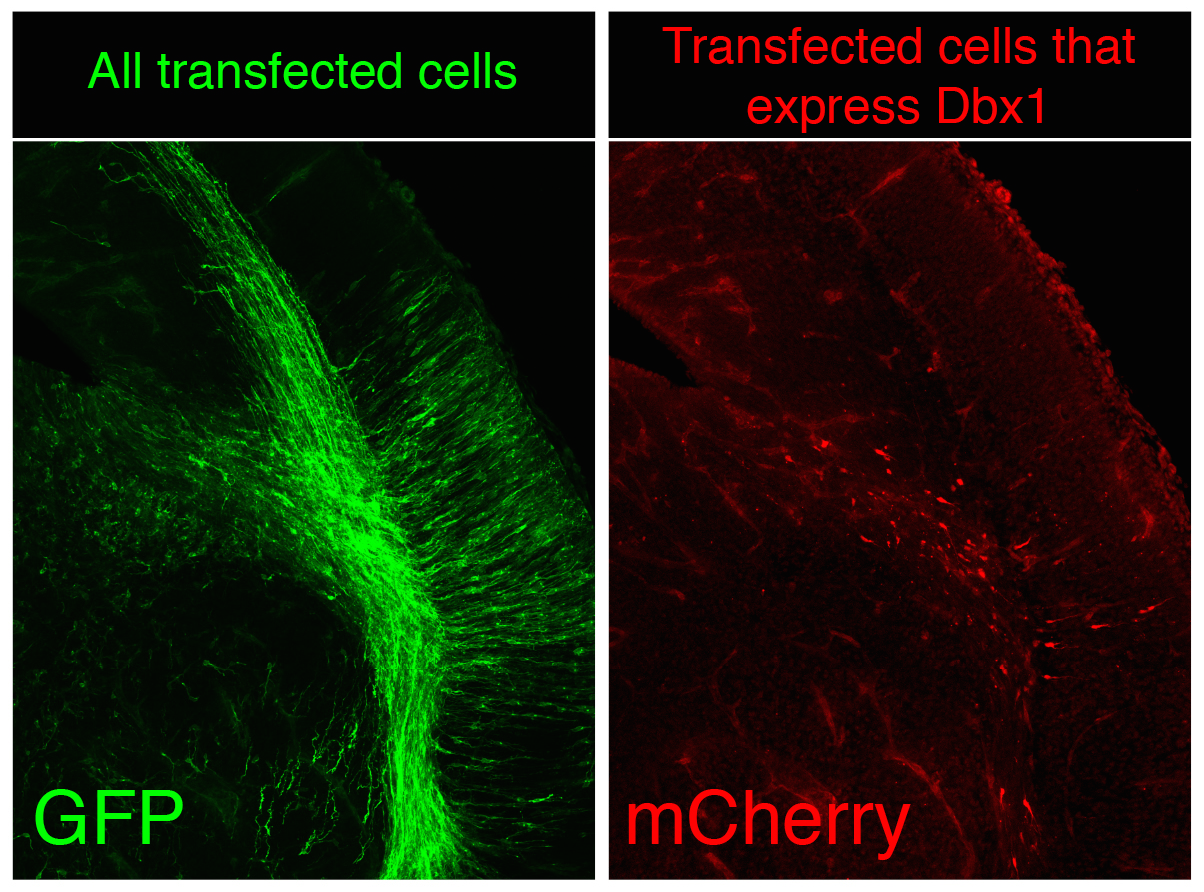 Although random integration by piggyBac is very capable to create a substantial number of surnames and though these are perpetuated in the genome the problem is not completely solved, since our ambitious genealogist doesn’t study a small town, but the biggest of the largest capitals, several magnitude orders over London, Mumbai or Mexico DF. There are millions of cells in the nervous system of a mouse, not to speak of the billions of cells in the human body. The countless combinations of surnames are simply not enough when considering billions of cells at once because the same random surname could occur independently in several progenitors during transposition. To avoid it, we apply two complementary strategies in CLoNe. First we reduce the number of transfected cells through the dilution of the Cre recombinase-expressing construct (which is responsible for the activation of the fluorescent labelling). Therefore in our particular cellular London, a small proportion of citizens do have a surname while a vast majority of the population doesn’t have a surname, so we can claim two individuals named Clayworth as relatives. Additionally, just as every genealogist does when refining the study to medieval kings, with CLoNe we decide a priori (before transfection) what cellular population we study the lineage in. During embryonic development stem cells express a variety of genes in order to perform their proliferative and regional identification functions. These genes are eventually very specific and identify a given population of progenitor cells. By associating the expression of Cre, and therefore the appearance of cellular surnames, to the expression of these identitary genes, CLoNe allows us to provide surnames to only our population of interest (Fig. 3, in the example we chose to selectively label in red cells expressing the transcription factor Dbx1). Remarkably this could be the main distinctive feature of CLoNe, the previous choice of the progenitor to be studied, instead of the a posteriori deduction of the labelled lineage. Ending the analogy, thanks to the employment of regulatory sequences of identitary genes, with CLoNe we can target and refine our study to the genealogy of the Clayworths from Notting Hill, or the Smiths from Kensington. And since we generate a great number of surnames we can always study the lineage of multiple cellular clones in the same piece of tissue (of multiple families in the same neighbourhood). The Clayworths, the Smiths, the Howshams AND the Skywalkers from Kensington can be studied at the same time, even though they are next-door neighbours. This cannot be achieved by other commonly used ways, such as viral methods, that only employ a single reporter gene.