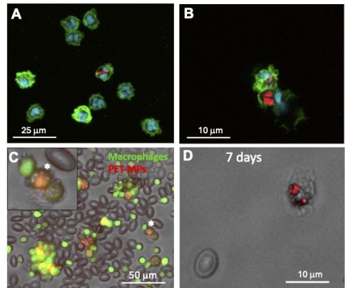 We are now focusing our investigation on the effects of MPs on macrophage function using both in vitro and in vivoapproaches. Interestingly, our preliminary results indicate that, compared to polystyrene or polyethylene manufactured spherical beads that are phagocytosed by a majority (>90%) of peritoneal macrophages from adult frogs at the same concentration, PET, and nylon 1-20 μm MPs fragments are internalized by only a minor fraction (~10%) of peritoneal macrophages. In addition, fewer PET and nylon MPs are internalized by individual peritoneal macrophage compared to manufactured spherical beads (Fig. 2A and B). We are in the process of developing a controlled aging process by UV treatment to determine if aged MPs might be phagocyted at a different rate than pristine MPs. To assess MP effect on macrophage function in vivo, we are taking advantage of the X. laevis transgenic line mpeg::GFP, where macrophages express the fluorescent GFP reporter. Intraperitoneal injection of a small amount of Nile red-stained PET-MPs in adult frogs allows the detection of GFP+ macrophages that have engulfed red fluorescent PET-MPs (Fig. 2C). Similarly, tadpole peritoneal macrophages can phagocytose red fluorescent PET-MPs following intraperitoneal injection. Moreover, we can detect macrophages with internalized PET-MPs up to 7 days after exposure (Fig. 2D), which suggests that, as also observed in vitro, MP engulfment does not induce marked cell death. This in vivo system will now allow us to follow the fate of macrophages with internalized MPs and determine whether their function in homeostasis, regeneration and immune response is altered.