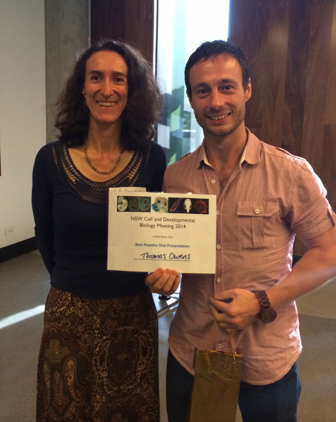 Dr Thomas Owens accepting the Post-doc speaker prize from Prof. Sally Dunwoodie (ANZSCDB, president-elect)