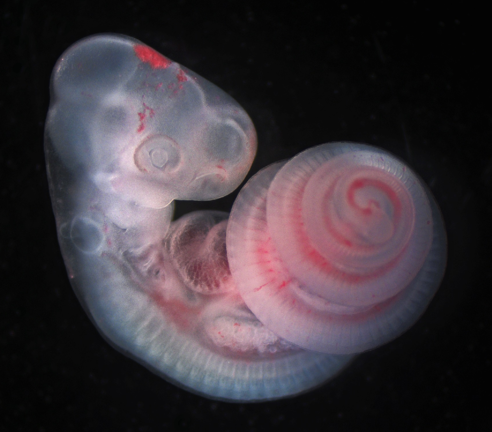 Runner up: Micro-imaging. “The spiralled snake axis” by Tyler Square. During early growth and development, most vertebrate animals look quite similar. Here, in this image of a one-day post-oviposition African house snake (Boaedon fuliginosus), we see many features that tie all vertebrates together: pharyngeal arches surrounding the mouth and throat (with gill slits between them), muscle segments (called somites) which will eventually contribute to the spine and musculature, and a chambered heart connected to a closed circulatory system to move oxygen and nutrients to tissues. During and after these stages, the novelties specific to a species or lineage begin to develop – here the 5mm long elongated body of the snake develops as a spiral to fit inside the egg.