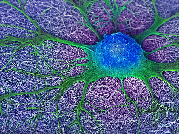Spinal cord injuries often lead to lifelong disabilities. To achieve functional recovery, the nerve pathways that were damaged must be reconnected. One potential solution is to induce the nerve stem cells already present in the adult spinal cord to reestablish these connections. This requires activating the stem cells to grow long extensions while simultaneously preventing the formation of scar tissue, which can block these extensions. This image from a NIH National Institute of Biomedical Imaging and Bioengineering-supported study shows a mouse nerve cell (blue/green) on a synthetic nanofiber gel (purple) designed to mimic healthy spinal cord tissue. The nerve cell has grown long extensions (green) into the gel. The researchers found that injecting these nanofibers at the site of a spinal cord injury reduced scar formation and helped to restore hind leg function in mice. By Mark McClendon, Zaida Alvarez Pinto, and Samuel I. Stupp