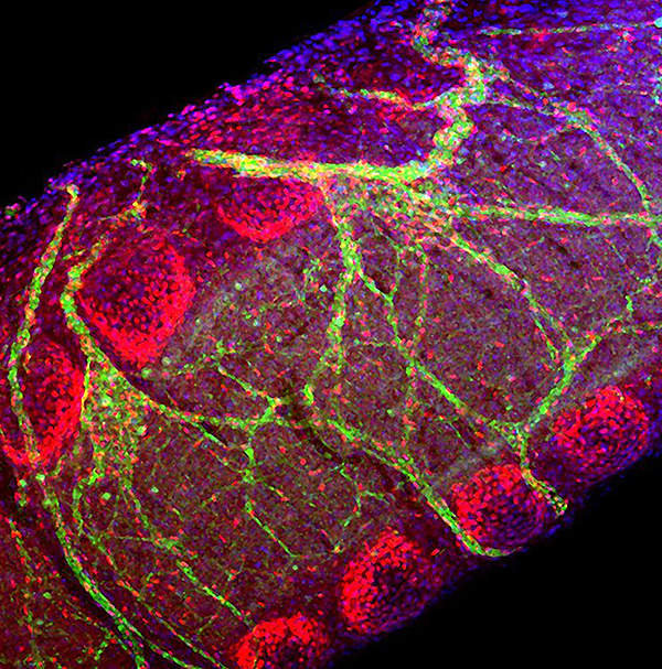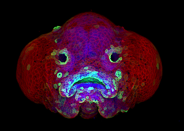 o form new tissues and structures during development, populations of cells move, often over long distances. This movement, called cell migration, is highly coordinated across space and time. This zebrafish (Danio rerio) larva was labeled with red fluorescent molecules to identify the migrating cells that will compose the surface of the fish’s skin, or epithelium. Genetic material (blue) and, in a subset of cells, a structural protein (green) were also labeled. Although this image is of a fixed zebrafish, the research group is using live imaging to observe the movement of these cell populations in real time. Drs. Ruiz and Eisenhoffer are researching cell migration to better understand normal facial development as well as the genetic mutations in humans that lead to congenital birth defects such as cleft lip and palate. By Oscar Ruiz and George Eisenhoffer