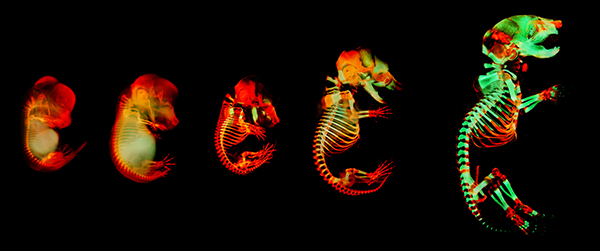 Proper bone and cartilage development is critical to support body structure and protect vital organs. For example, the skull supports and protects the brain while the ribs protect the heart, lungs, liver, and spleen. As seen in this image of mice at different developmental stages, bone (green) and cartilage (reddish-orange) formation begins during the embryonic period (far left) and continues throughout adolescence (far right). The NIH National Institute of Dental and Craniofacial Research supports this research program on genetic mutations that cause abnormal skeletal formation and underlie many congenital birth defects. By William Munoz, Karla Terrazas, and Paul Trainor