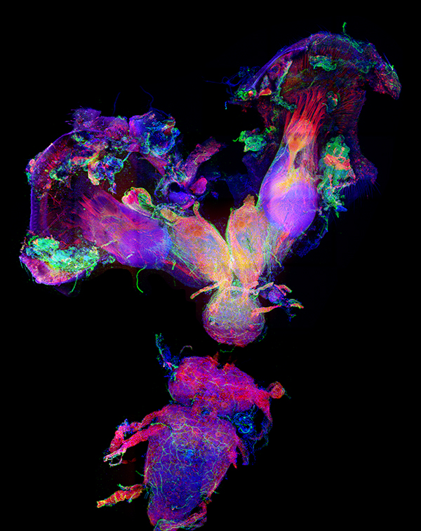 This highly-detailed image of the central nervous system from a horned dung beetle (Onthophagus sagittarius) was captured with a laser-scanning confocal microscope. Imaged during the late pupa stage, this beetle was about to complete metamorphosis. The optic lobes (top) are in the process of growing and extending towards the outer surface of the head to form a pair of compound eyes. Different colored fluorescent labels were used to visualize the distribution of a structural protein (red), the neurotransmitter serotonin (green), and genetic material (blue). This image is from a National Science Foundation-supported research project on the evolution of novel and complex traits. By Eduardo Zattara, Armin Moczek, Jim Powers, Jonathan Cherry, and Matthew Curtis